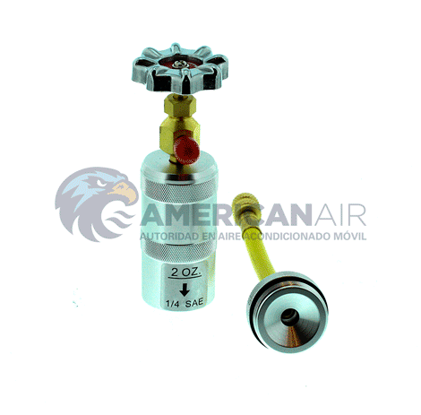 Cargador manual de aceite, se conecta directo al manómetro a través de la manguera amarilla para hacer la carga de refrigerante en sistemas de aire acondicionado, además de cargar aceite también se puede ocupar para introducir al sistema tintes detectores de fugas y selladores de micro fugas, todo cuando se realiza la carga